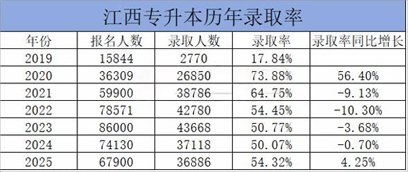 江西专升本录取率分析:2025年呈现五年来的首次增长,根据最新数据显示,2025年江西省专升本考试报名人数为67,900人,实际招生计划为36,886人。经计算得出,2025年江西专升本整体录取率为54.32%。