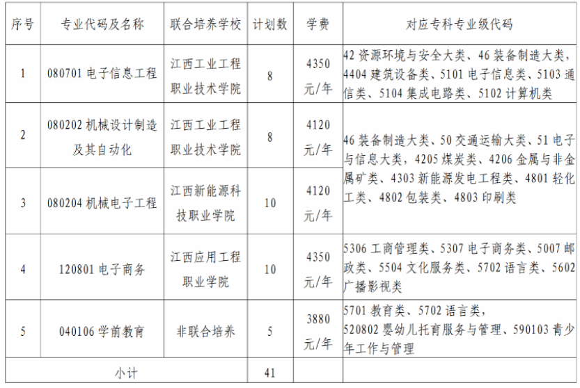 2024年学校专升本免试招生专业共5个,招生计划41人,招生专业和计划如下表: