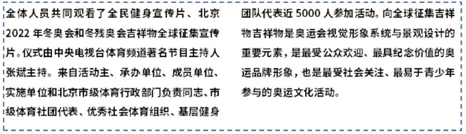 8月8日,2018年全国“全民健身日”活动主会场●北京2022年冬奥会和冬残奥会吉祥物全球征集启动暨北京奥运城市体育文化节开幕式,在北京奥林匹克公园庆典广场盛大举行。仪式首先播放国际奥委会主席巴赫先生祝福北京奥运会成功举办十周年纪念活动视频。北京市委书记、北京冬奥组委主席出席活动并宣布“2018年全国‘全 民健身日’主会场活动开始,北京2022年冬奥会和冬残奥会吉祥物全球征集发布启动”。北京市市长、北京冬奥组委执行主席陈吉宁致开幕辞,国家体育总局局长,北京冬奥组委执行主席苟仲文致辞,北京市副市长、北京冬奥组委执行副主席张建东做北京2022年冬奥会和冬残臭会吉祥物全球征集说明,平昌冬奥会短道速滑500米冠军武大靖宣读全民健身倡议书,号召大家在运动中收获健康,在健康中享受快乐,在快乐中体验人生。