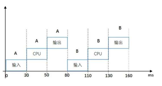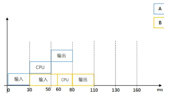 27.有两个进程,其中进程A输入设备占用30ms,使用CPU占用20ms,使用输出设备占用30ms,进程B输入设备占用30ms,使用CPU占用20ms,使用输出设备占用30ms。下图是进程运行的时间图。回答下列问题。